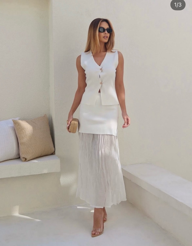 Conjunto blusa e saia tricô modal.
