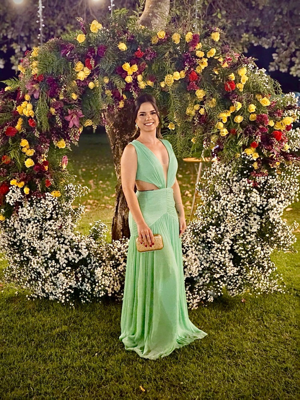 Vestido de festa com abertura nas laterais e tecido com pequenos brilhos dourados