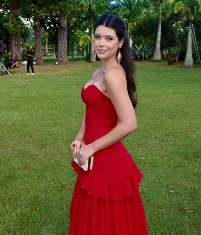 Vestido longo de chiffon composto por duas peças. A base do vestido é sem alças, com caimento reto e um babado assimétrico no quadril. Acompanha um casaquinho sobreposto de manga única, com drapeado lateral. O casaquinho é removível, permitindo variações no uso.