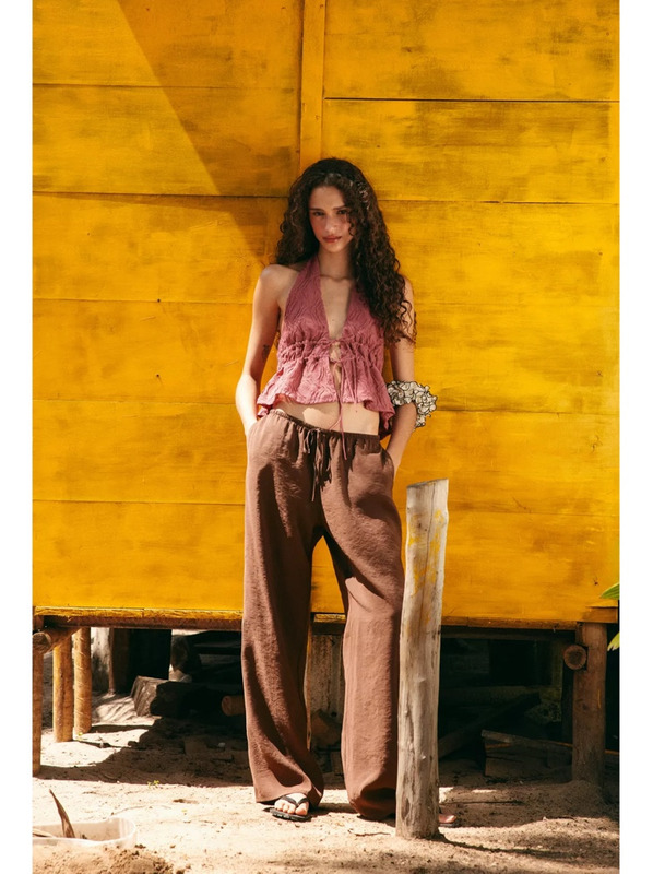 Calça confeccionada em tecido fluido. Cintura media com elástico ajustável com bolsos laterais e falsos bolsos nas costas.