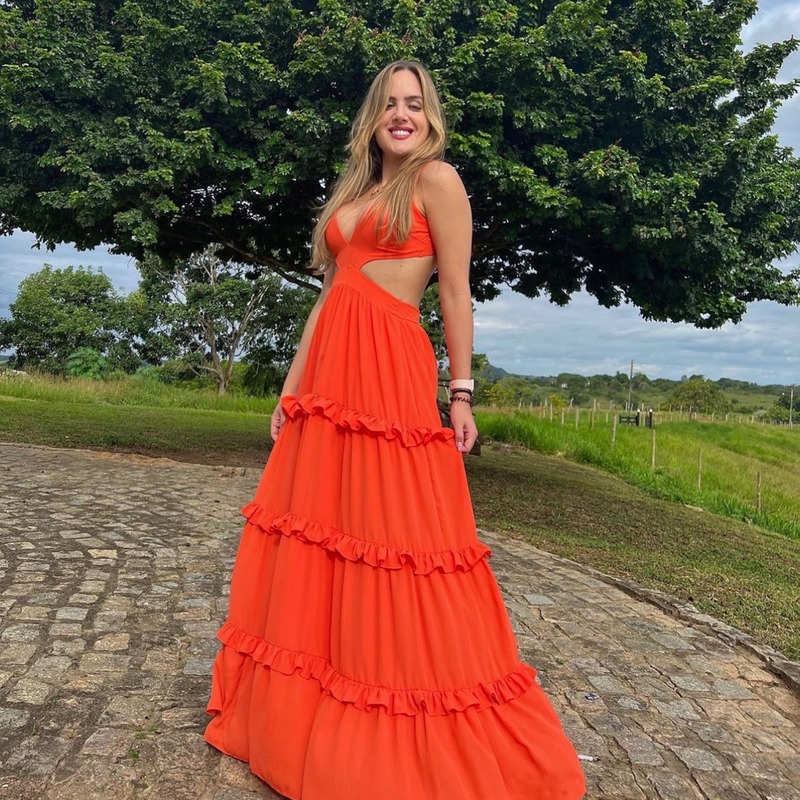 Vestido longo, fluido e com recortes. 🍊