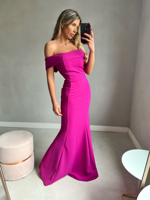 Vestido de festa sem alça na cor fúcsia.