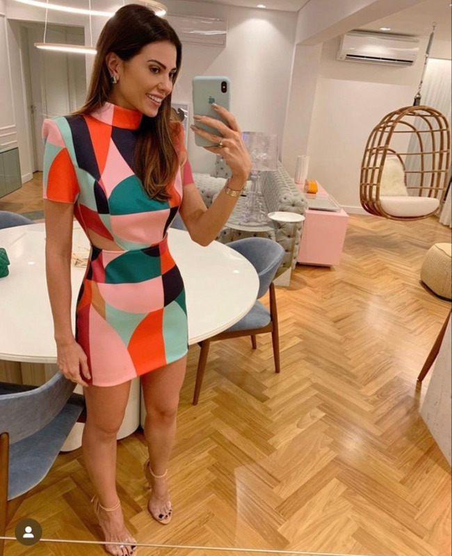 vestido curto colorido em neoprene, com estampa geométrica, recortes e ombro estruturado.