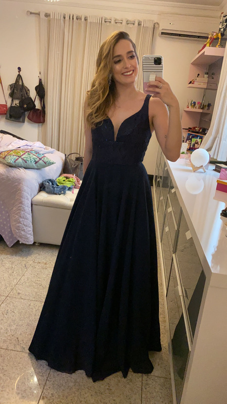 Vestido com decote lindo, na foto parece preto mas ele é azul escuro! Hahaha