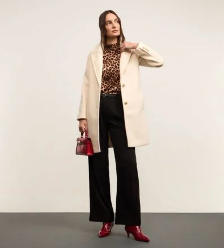 Casaco alongado, decote com lapela e abotoamento duplo.