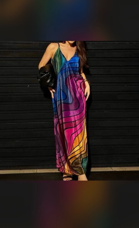 vestido desejo da farm, esgotadíssimo. estampa onda de cor, efeito veludo molhado, colorido, longo, com alcinhas ajustáveis, fendas laterais na perna, tamanho p, perfeito.
