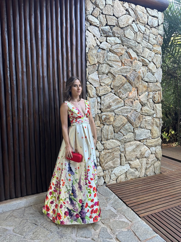 Vestido longo de princesa com decote em v frente e costas Estampa parece que foi pintada a mão. Uma obra de arte para seu próximo casamento