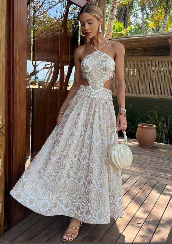 Vestido midi de organza bege: sofisticado e elegante, o vestido apresenta bordado em dourado, decote em "A" e recorte cut-out na cintura e nas costas. Veste P/M . Perfeito!