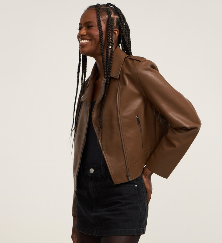 Jaqueta biker regular em PU com ziper e bolsos Material sintático Zíper metálico Gola lapela Tamanho M