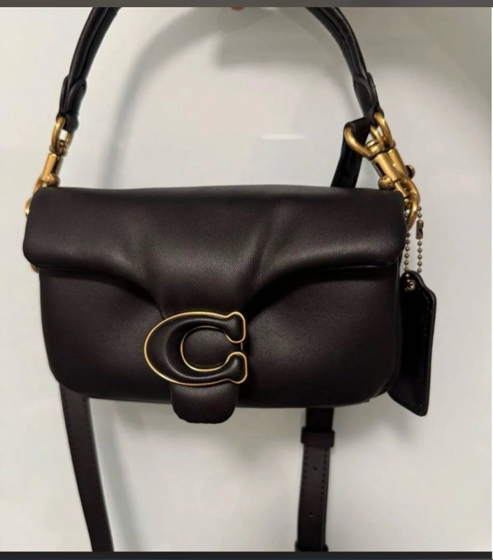 Bolsa Coach preta, com bolsos internos, cabe IPhone Pro Max. Tamanho 18 cm