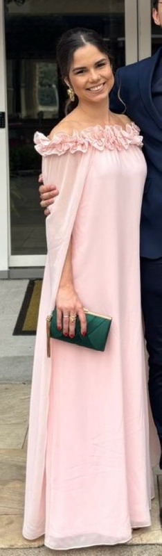 Vestido longo liso rosa com capa, ombro a ombro com “flores”.
