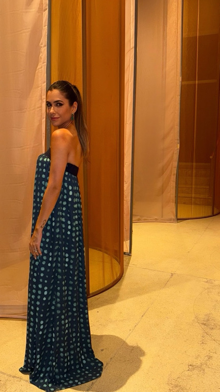 Vestido longo fluido, tomara que caia. Com elástico no busto deixando justo e firme. Tenho 1.75 e usei de rasteira