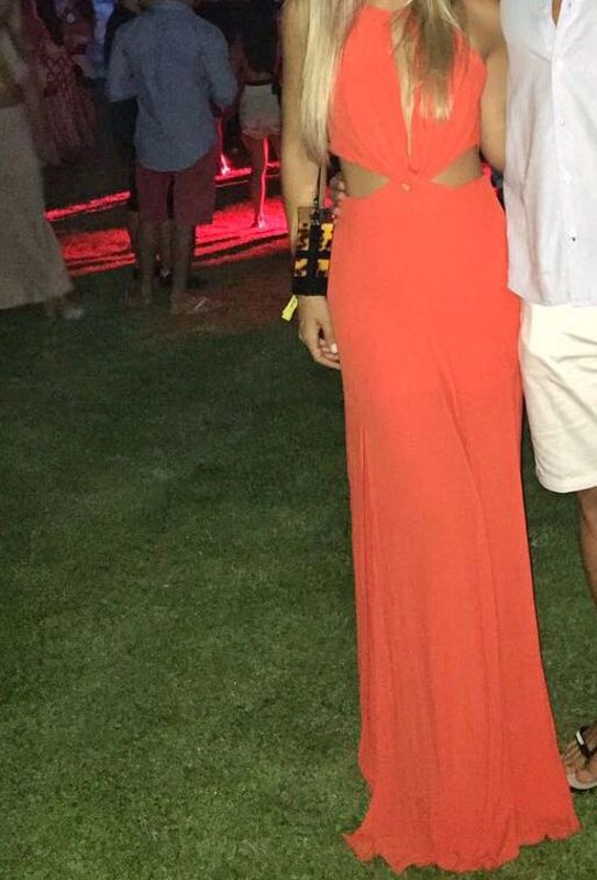 Vestido longo laranja, com recortes na lateral. Tecido crepe