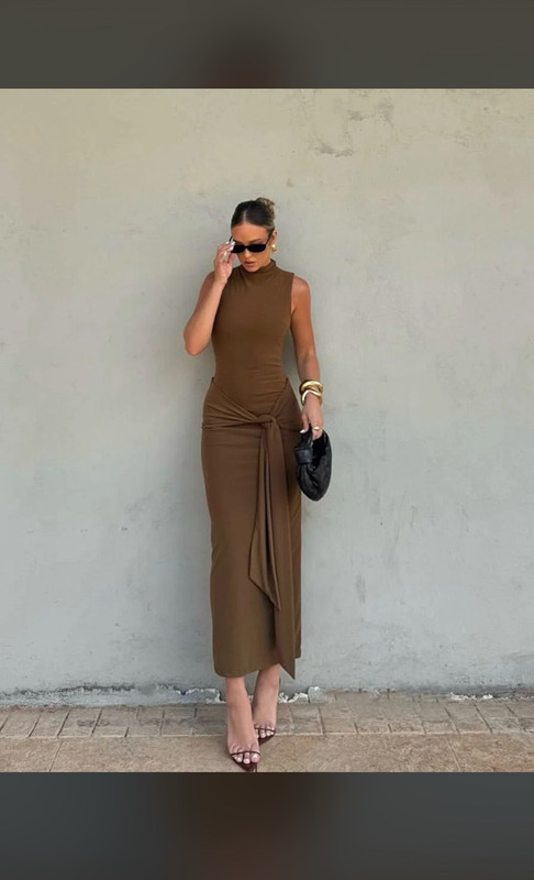 Vestido midi com gola alta e sem mangas. Detalhe de laço com nó do mesmo tecido. Forro interior combinado. Fecho atrás com zíper oculto na costura. Cor: verde musgo (quase um marrom)