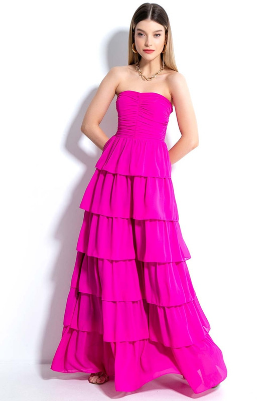 Vestido longo estilo tomara que caia com busto franzido e cintura ajustada que confere feminilidade à silhueta. Sua saia ampla com recortes e babados ao longo do comprimento confere um ar sofisticado ao look. 💖🌟
