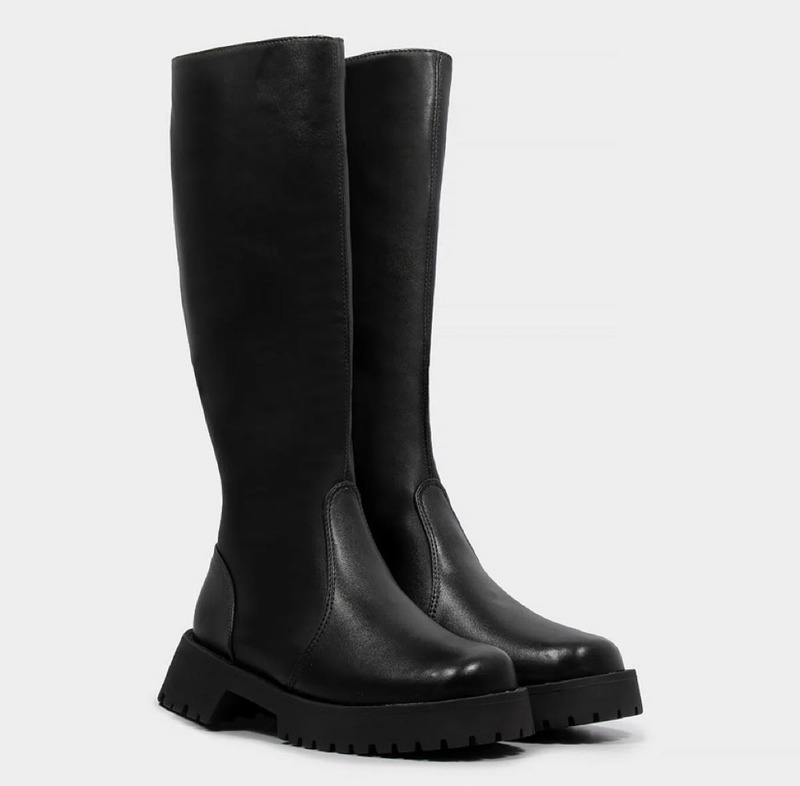Bota em couro com sola tratorada e cano alto (abaixo do joelho). Altura do cano: 35cm Altura “salto” tratorado: 4,5cm