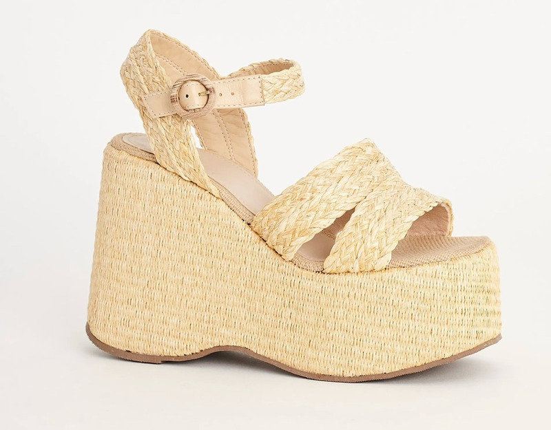 Toda revestida em palha natural, palmilha forrada no linho que absorve o suor, fivela em madeira. Ela tem o salto de 12 cm, mesmo sendo alta, a plataforma garante o conforto.