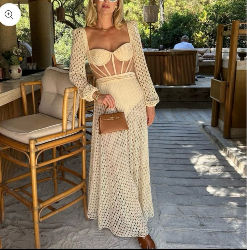 Vestido praia com hot paint embutido com manga longa, saia e mangas no guipier.