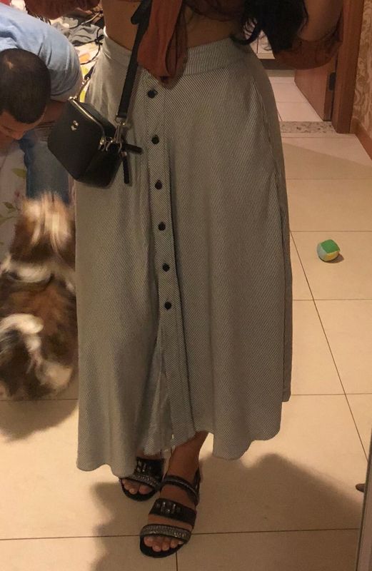 O tecido tem umas listrinhas bem finas, saia modelo Midi