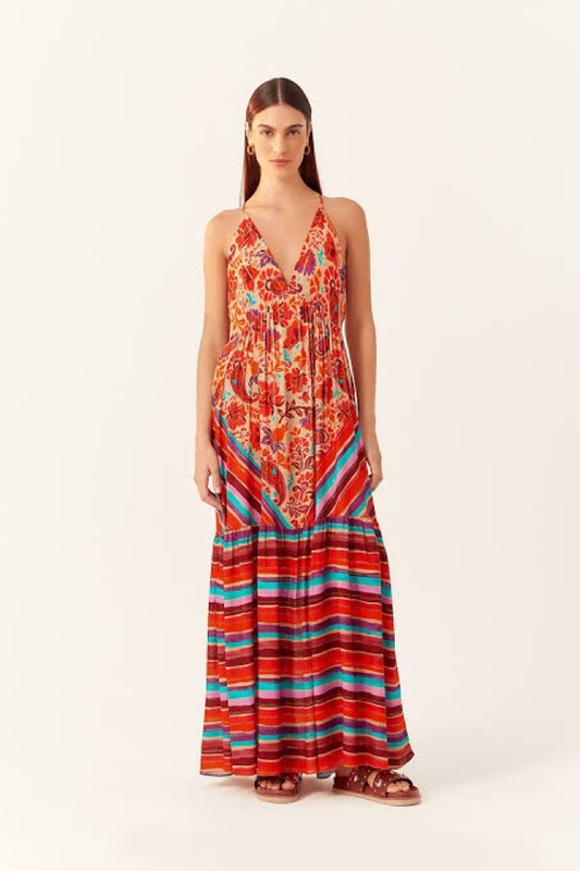 Vestido mix de estampas dress to MUITO lindo!! O tecido tem fios de lurex dourado e ele brilha ✨