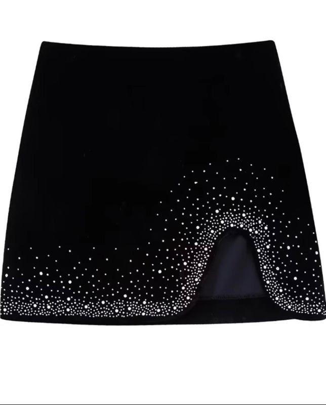 Saia curta com em veludo, com aplicações. Tamanho P. Minha altura: 1,70