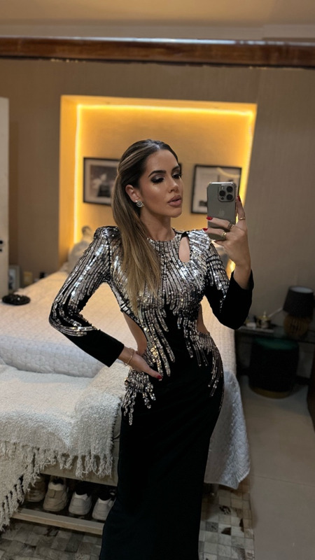 REVELANDO TODO O SEU LADO ELEGANTE E SENSUAL, O VESTIDO LONGO CONTA COM APLICAÇÕES DE PAETÊS SUPERESPECIAL. OS RECORTES EM CUT OFF DESENHAM A SILHUETA, GARANTINDO UM ESTILO ÚNICO JUNTO COM AS MANGAS LONGAS, DECOTE REDONDO E ACABAMENTO EM VELUDO.