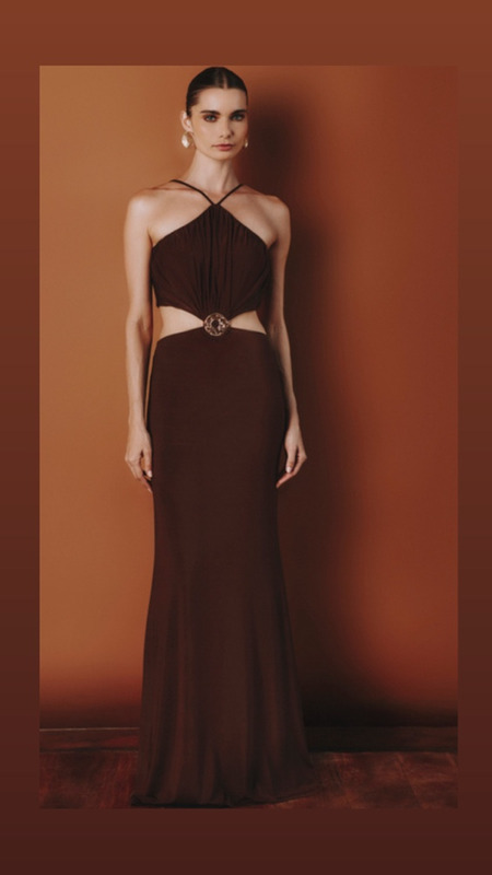 Vestido longo Rock Lola em Jersey, com recortes. Coleção atual, cor marrom super em alta. Tamanho P (veste até 38). Perfeito!