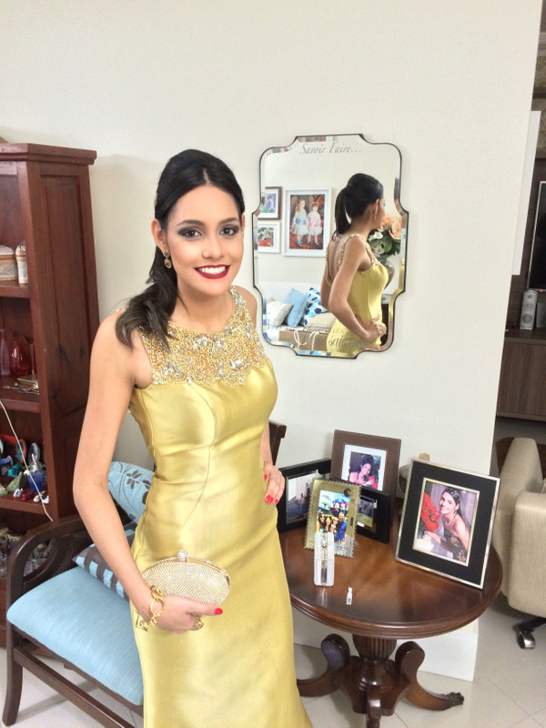 Vestido dourado com bordado nas costas e na frente. Decote V nas costas. Usado apenas 1x