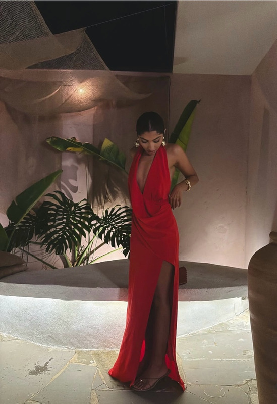 fechamento por botões na parte de trás do pescoço. drapeado na lateral direita
