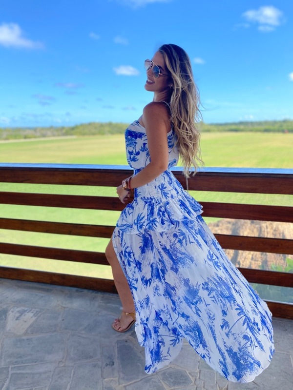 Vestido longo estampa azulejo com fenda na perna
