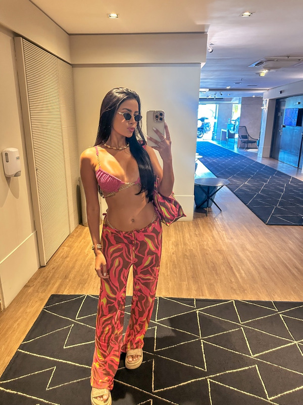 Conjunto biquíni lurex com corrente e calça estampada. TAM P/36